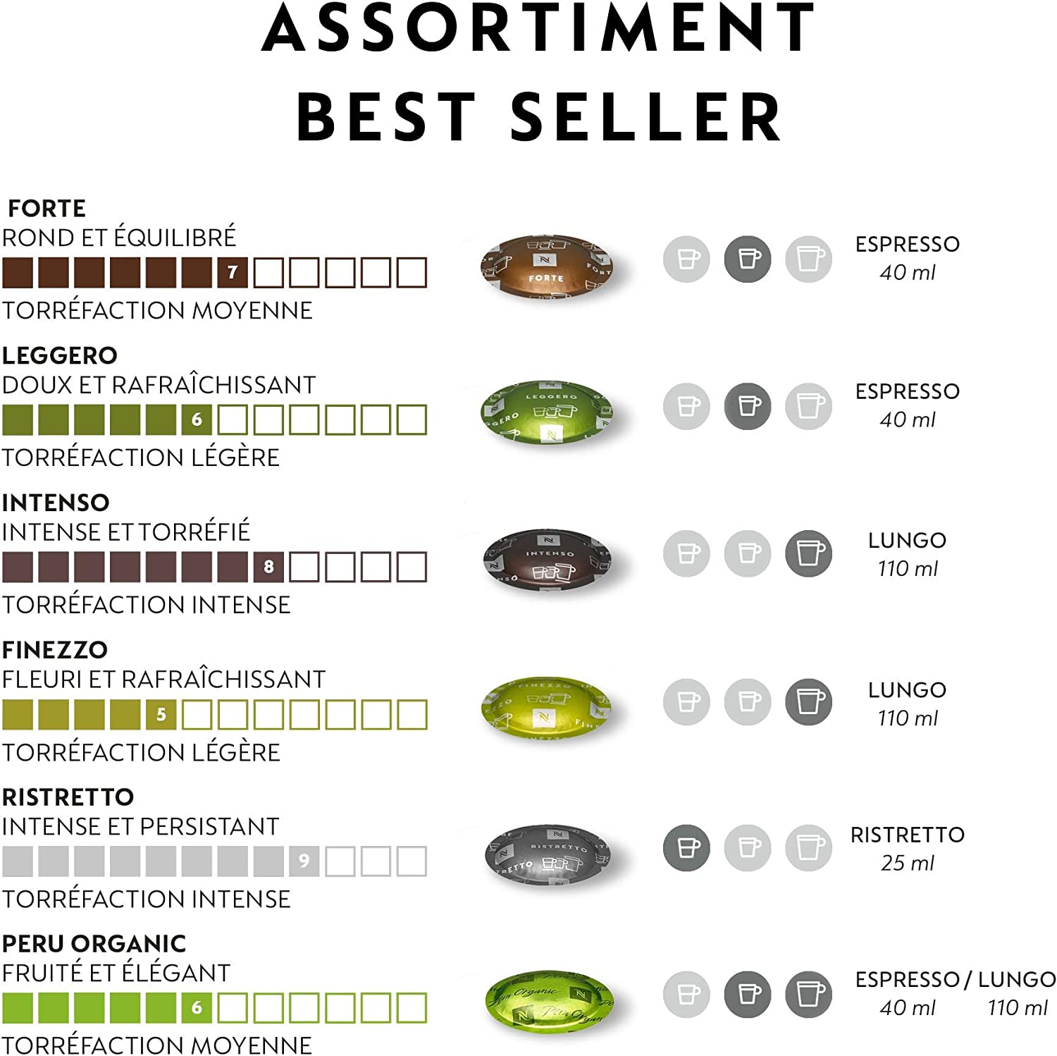• Contenu : Assortiment 300 capsules Top Selection Nespresso Professionnel, Inclus : 50x Ristretto, 50x Forte, 50x Leggero, 50x Intenso, 50x Finezzo, 50x Peru Organic, Poids net (300 capsules) : 2,3 kg