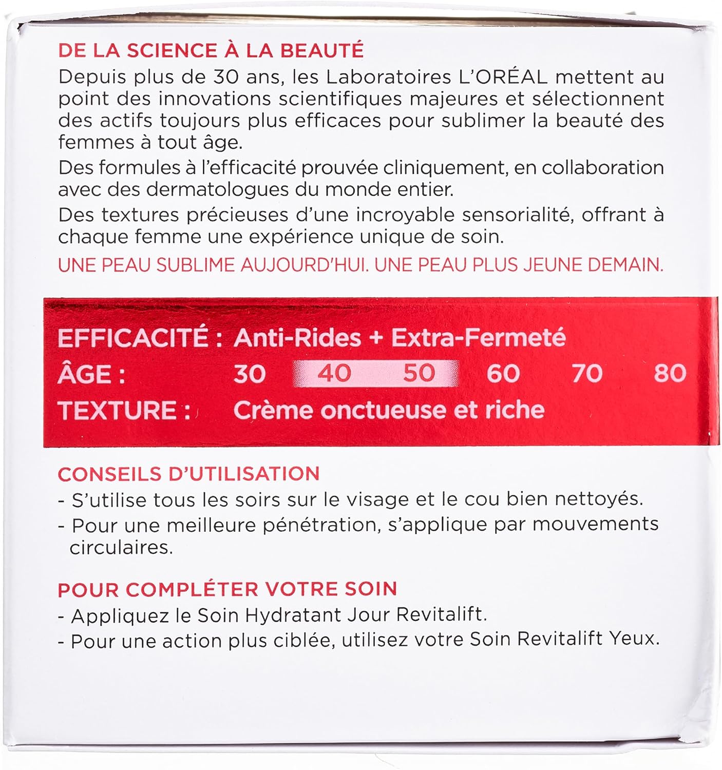 - Application : Appliquer le soir par mouvements circulaires ascendants sur le visage et le cou nettoyés, Produits complémentaires : sérum, soin hydratant jour et soin hydratant yeux de L’Oréal Paris Revitalift