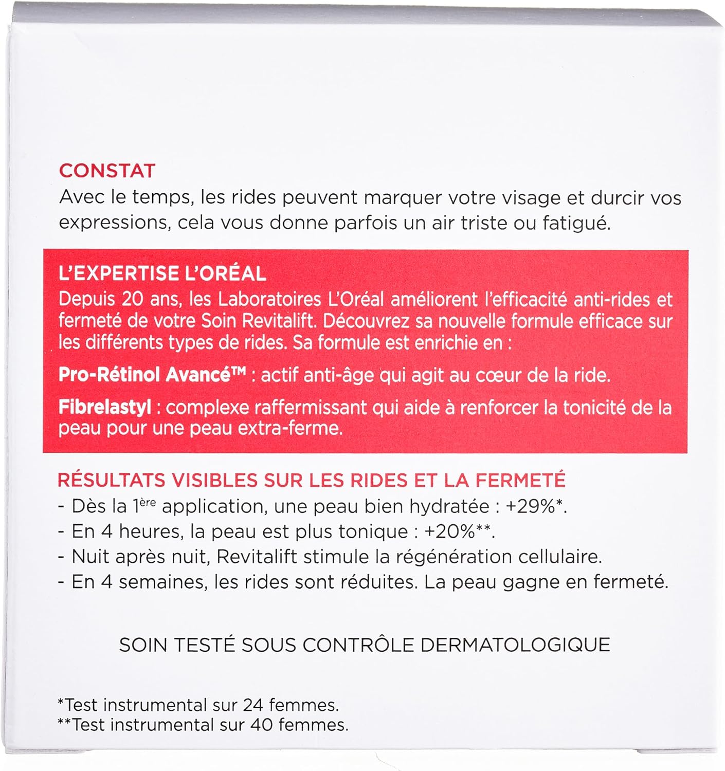 - Formule composée d’un actif anti-rides puissant (Pro-Rétinol Avancé) pour lisser la surface de la peau et d’un complexe raffermissant (Fibrelastyl) pour renforcer la tonicité de la peau