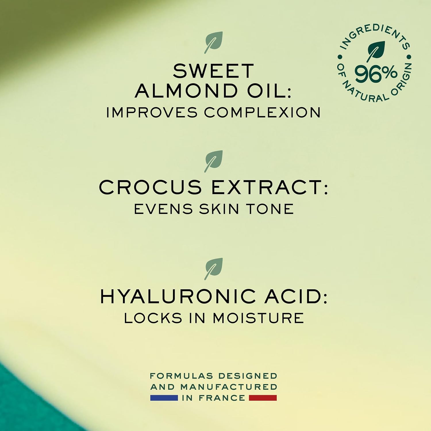 Aqua/eau, glycérine, prunus amygdalus dulis, huile d’amande douce, tricycéride caprylique/caprique, éther disocrylylique, alcools C14-22, hydroxyéthyl urée, parfum/parfum, tocophérol, phénoxyéthane. OL, C12 -20 glucoside d’alkyle, éthylhexylglycérine, acryliques/C10-30 alkylate crosspolymer, acide déshydroacétique, extrait de cellule de feuille de bougainvilléa, gluconate de sodium, stéaroyle de sodium TAMATE, XEN. Gomme d’anthan, butylène glycol, acide hyaluronique, hydroxyde de sodium, lactate d’ammonium, glucose d’ascorbyle, extrait de feuille d’olée europée (olive), zinc PCA, extrait d’Undaria Pinnatifida, extrait de ferment d’alteromonas, THEOBROMA Extrait de cellule de feuille de cacao (cacao), extrait de fleur de crocus sativus, alcool benzylique, acide ascorbique, salicylate de benzyle, linalol, coumarine, géraniol, citronnelle [N3201/B]
