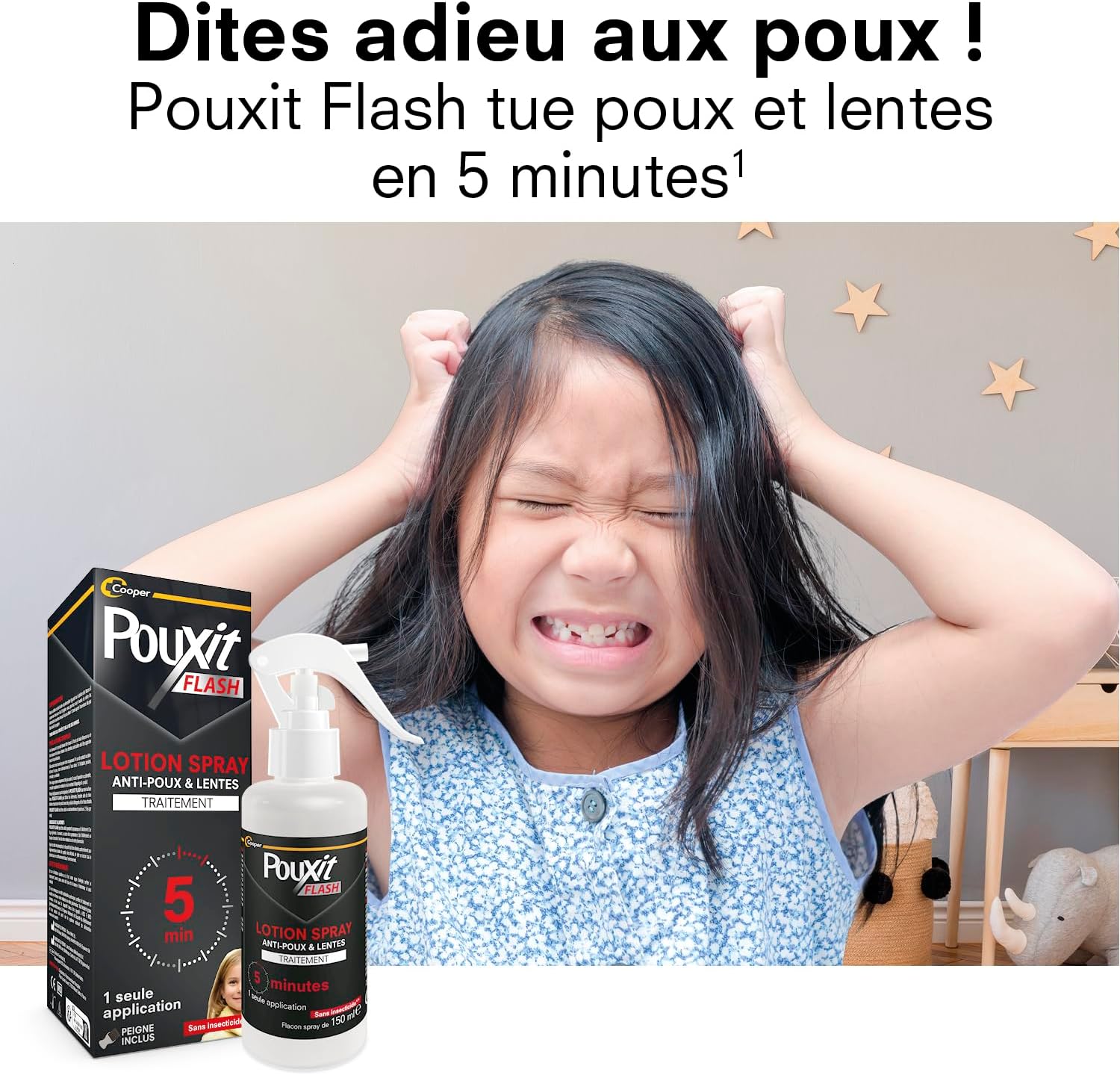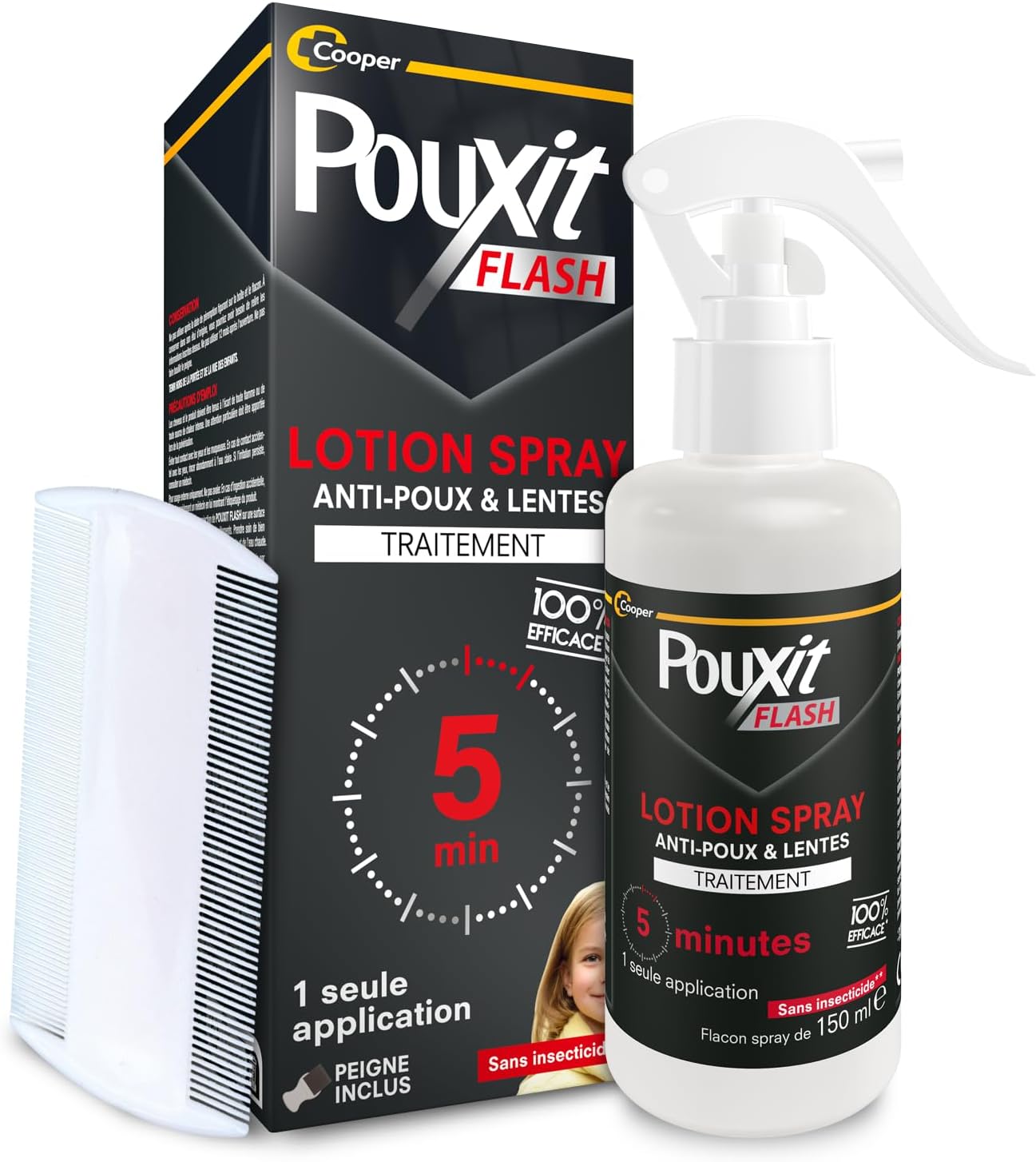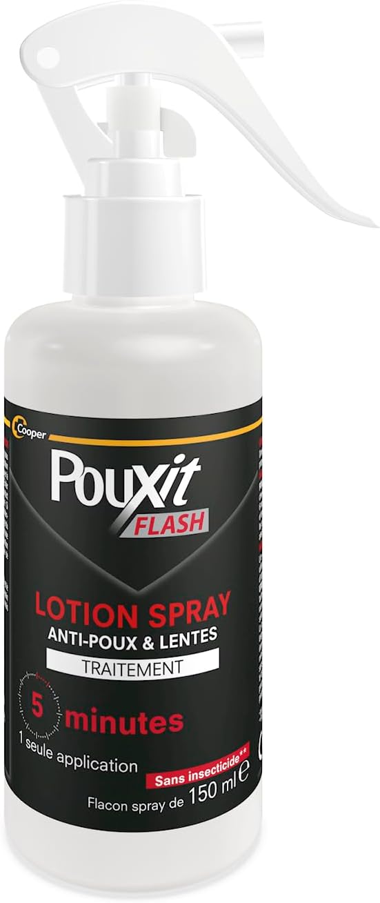 - DITES ADIEU AUX POUX EN 5 MINUTES ! Grâce à son action rapide, Pouxit Flash ne nécessite que 5 minutes de pose pour éliminer poux et lentes (1). En format spray, il est pratique à utiliser et avec son peigne inclus, vous pouvez ensuite retirer facilement les poux et lentes morts. Pouxit Flash peut s’utiliser dès l’âge de 6 mois ainsi que chez les femmes enceintes ou allaitantes. Il convient à tous les types de cheveux. 1 flacon de 150 ml permet de traiter jusqu’à 6 personnes infestées