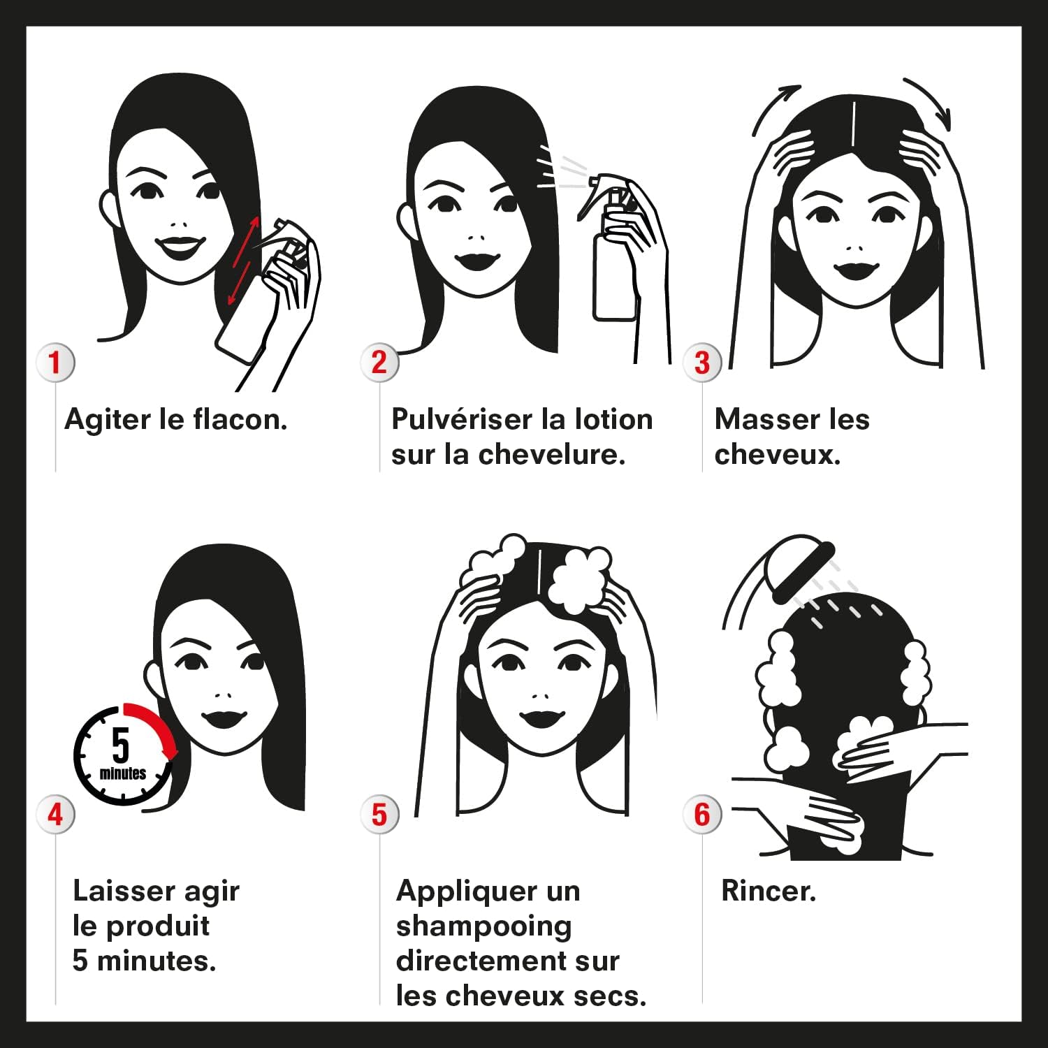 - UTILISATION : Bien agiter le flacon avant utilisation, couvrir les épaules pour éviter de tâcher les vêtements. Pulvériser la lotion sur le cuir chevelu et les cheveux secs, des racines jusqu’aux pointes, en veillant bien à ne pas oublier les oreilles, la nuque et les tempes. Masser les cheveux afin d’imprégner complètement la chevelure. Laisser le produit agir 5 minutes. Appliquer ensuite un shampooing sans mouiller les cheveux, en s’assurant de couvrir l’intégralité de la chevelure. Rincer. Si nécessaire, répéter l’opération. Le traitement peut être réalisé sans peigne. Néanmoins, afin de faciliter le retrait des poux et lentes, il est conseillé d’utiliser le peigne inclus